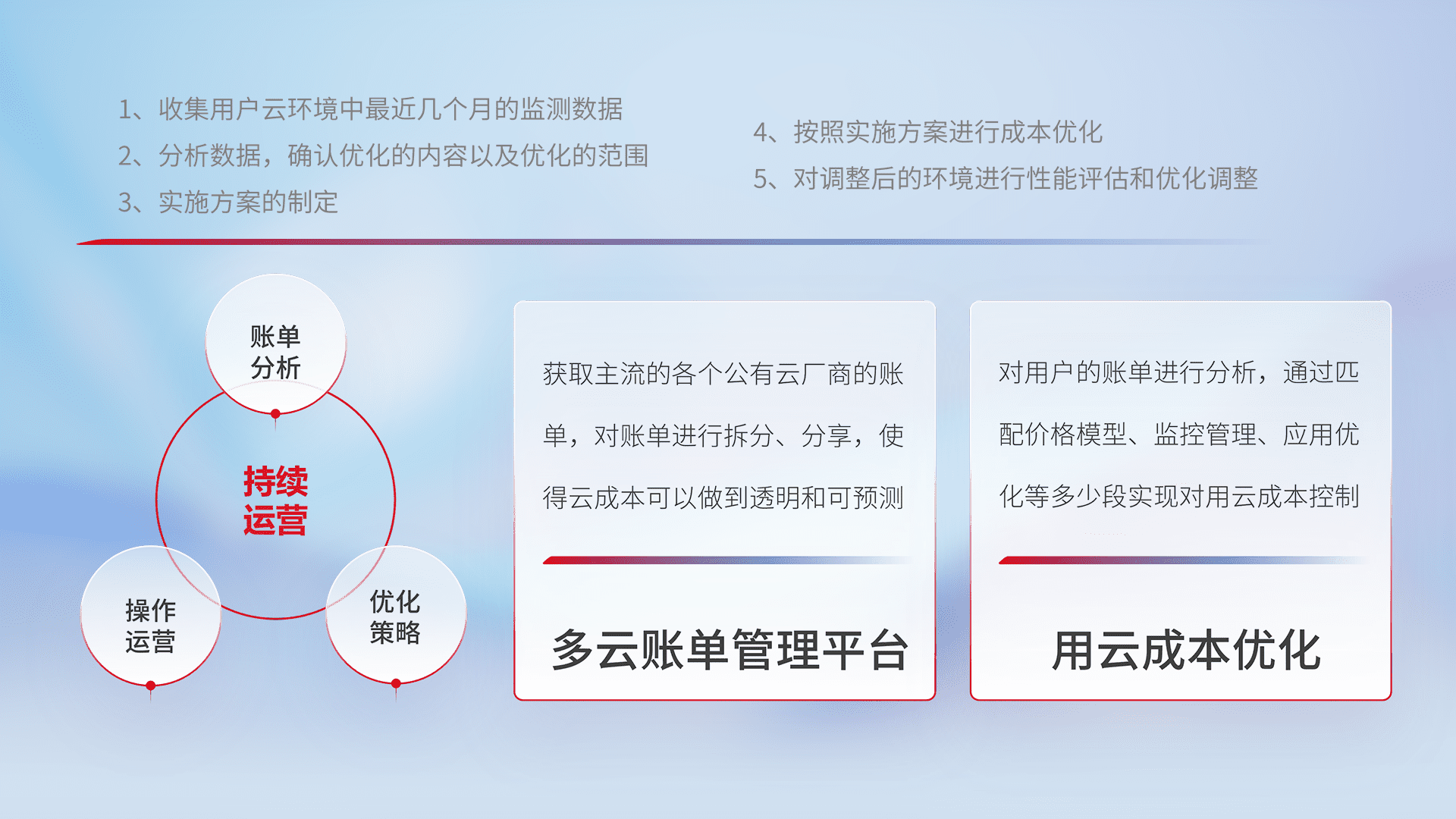 通过多云纳管,,以统一的资源数据模型把客户的云资源进行抽象和封装,,,,进而实现对多云资源的统一操作,,,,保障云资源管理的可靠性、、、、稳定性与可用性。。。。量身定制化运维内容,,配置、、、开发运维、、补丁管理、、、、备份、、监控、、认证和访问管理、、审计和日常巡检等,,保障在用云过程中的可靠度,,,,稳定度以及高可用率。。。