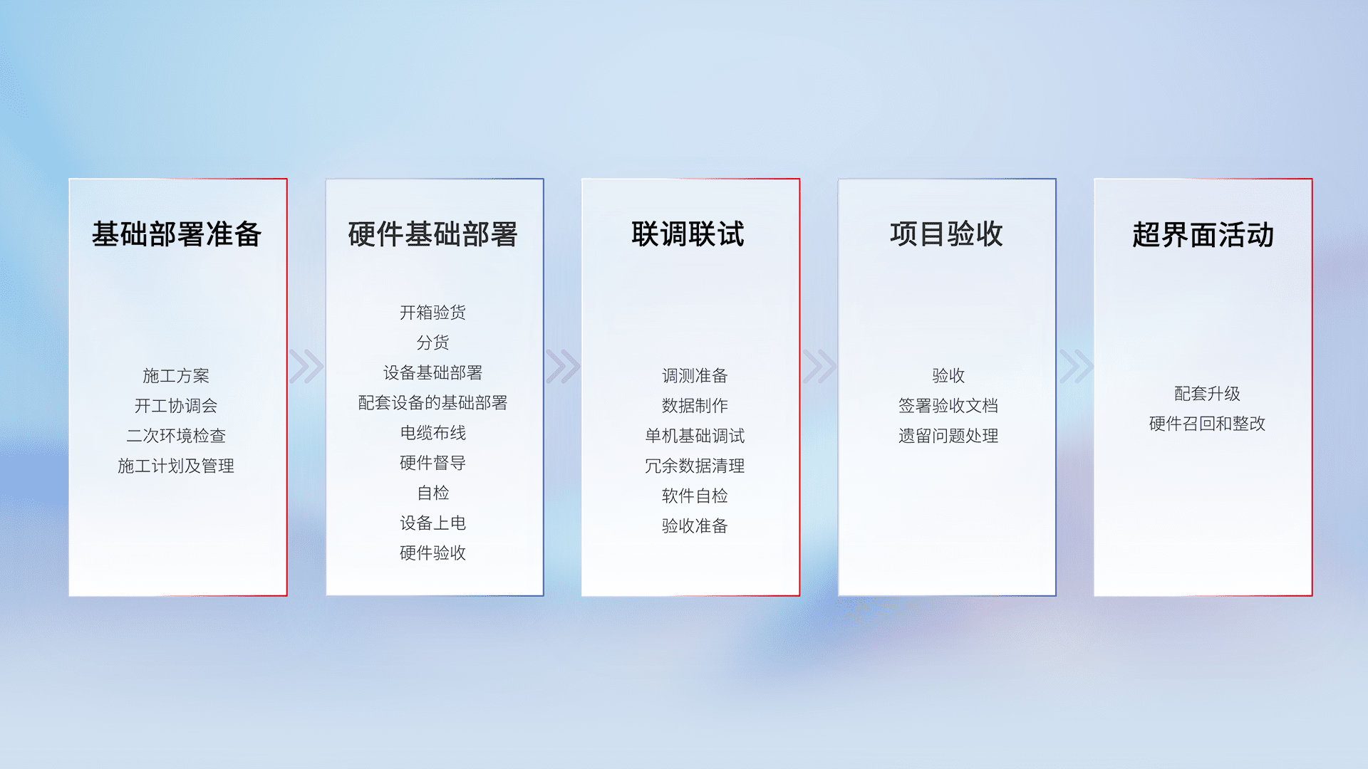 从基础部署准备、、硬件基础部署、、、联调联试、、项目验收、、越界面活动的全过程可追溯,,,保证施工质量和进度。。
